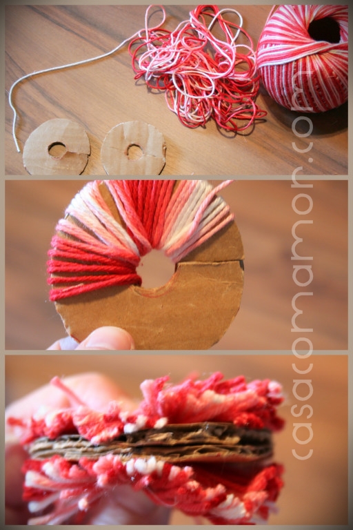 Como queria fazer pompons bem lindos, decidi procurar uns tutoriais no YouTube, e achei vários. A maioria deles ensinava a cortar dois círculos no papelão pra servir de guia pra enrolar os fios, então foi o que eu fiz.