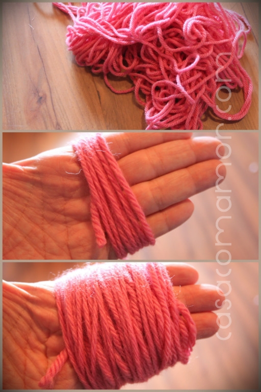Peguei a lã e enrolei ao redor dos quatro dedos da mão, fazendo várias camadas, até ficar bem gordinho: