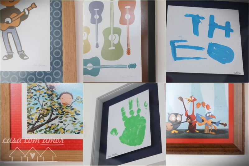 Sapatinhos que eram dele quando bebê estão no meio das artes feitas por ele mesmo e das prints, compradas na Etsy.