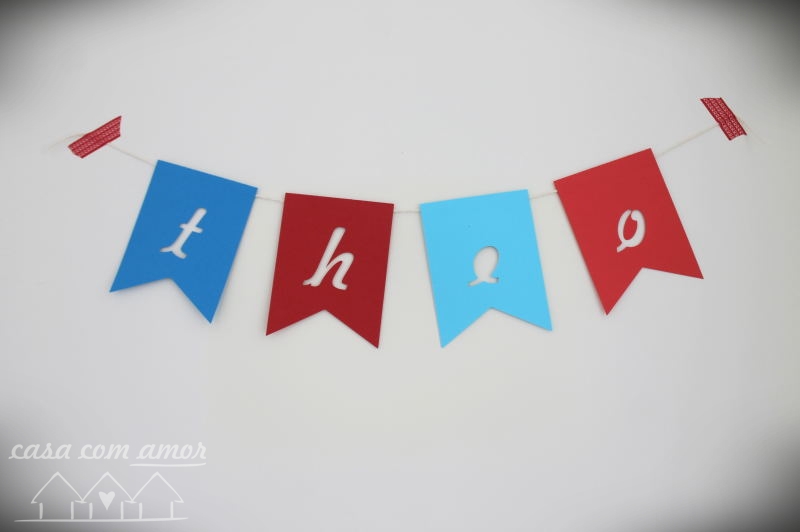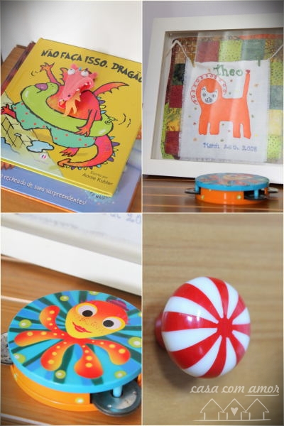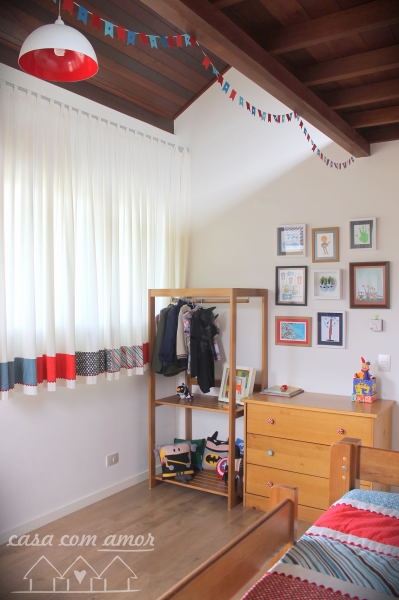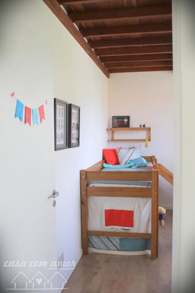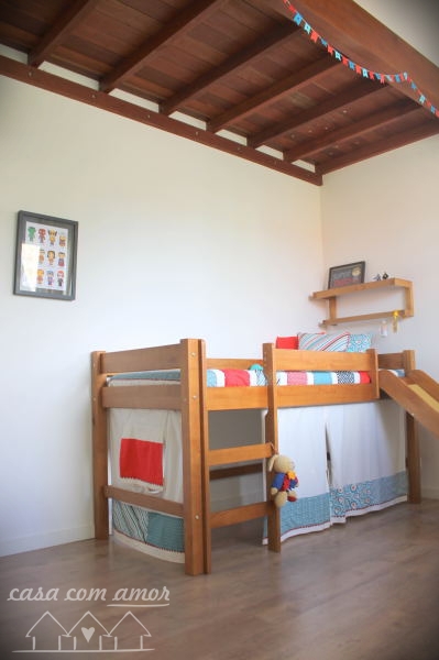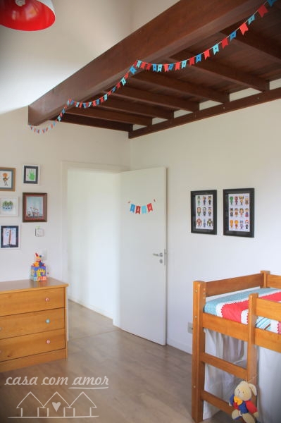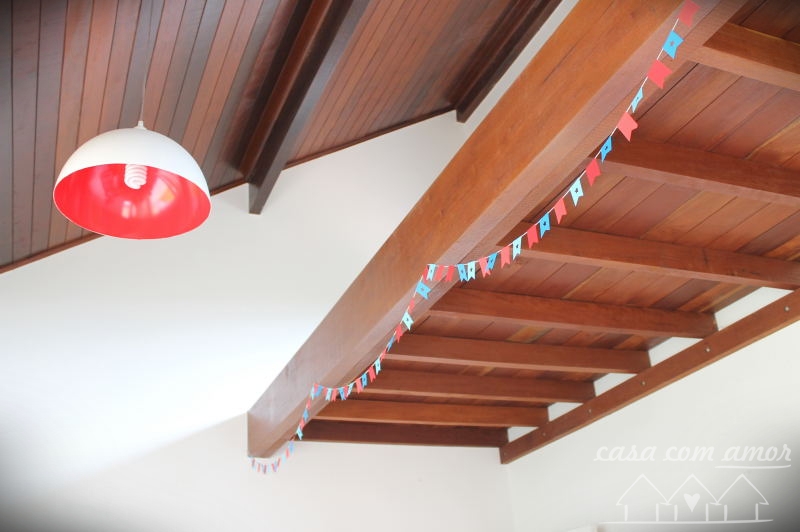 No alto, a luminária vermelha e branca e as bandeirinhas que eu fiz, penduradas no mezanino, ao qual o menino terá acesso por uma escada quando for maior.