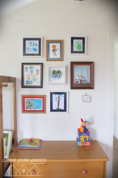 Aproveitamos o espaço vazio acima da cômoda pra colocar os quadros.