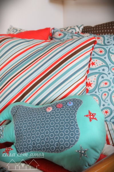 As almofadas são dos mesmos tecidos, algumas com acabamento feito com cianinha vermelha também.