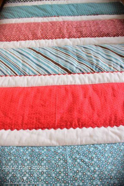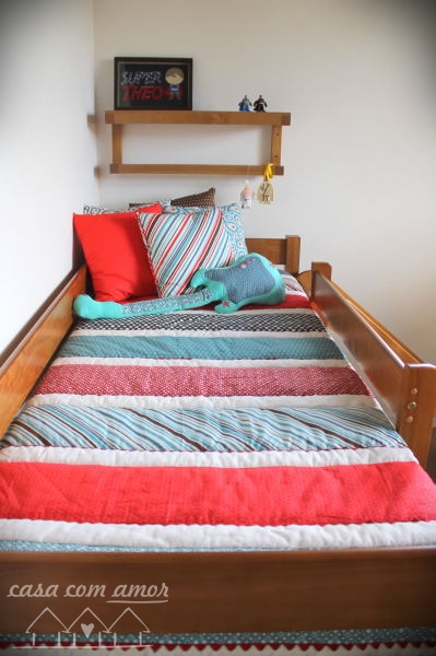 A colcha intercala o fundo branco com faixas dos tecidos arrematadas com cianinha vermelha.