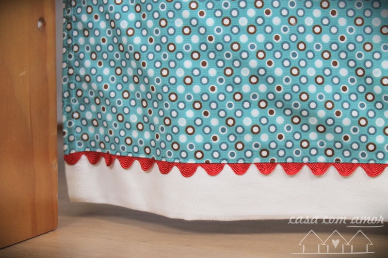 As cortinas ganharam um barrado com faixas de tecidos estampados intercalados em faixas de mais ou menos 60 cm de comprimento.