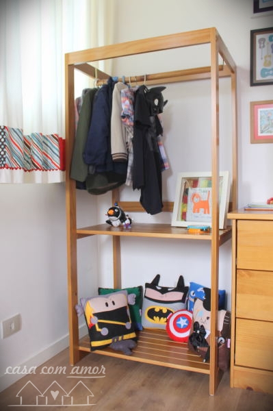 No rack as referências aos super heróis são mais fortes, com a fantasia do Batman junto aos casacos, o submarino do Pingüim e as almofadas de heróis e vilões, feitas em feltro e outros materiais.