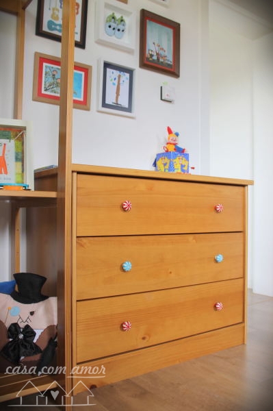 A cômoda ganhou puxadores novos, pra ficar mais alegre.