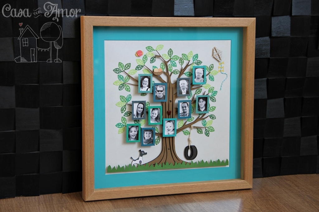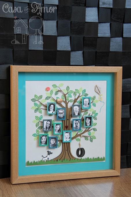 Como eles moram longe das famílias materna e paterna, a Débora queria um quadrinho pra colocar no quarto do bebê, que o ajudasse a lembrar dos avós, tios e primos, então ela teve a ideia de uma árvore genealógica.