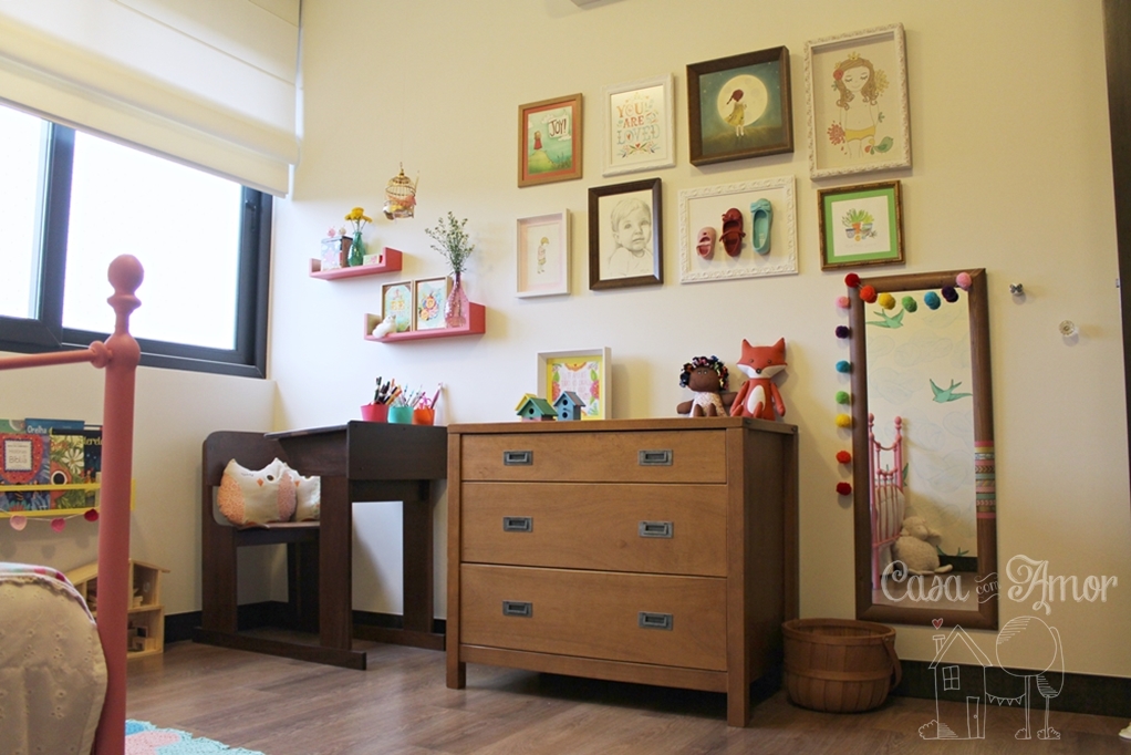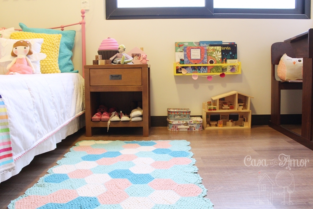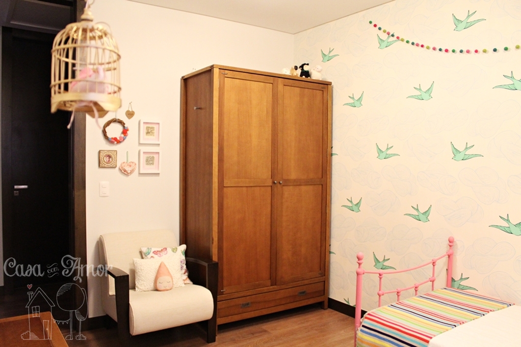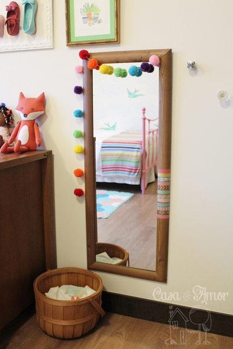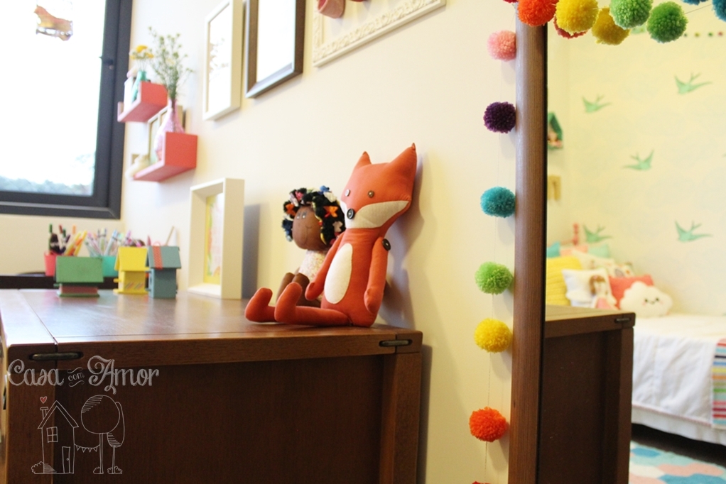 quarto feliz 901 E pendurei os pomponzinhos da festa arco íris, que ficaram lindinhos ali.quarto feliz 931Ao lado do espelho, pendurei dois puxadores, que fazem o trabalho de ganchos, onde a moradora pendura seu pijaminha pela manhã e as roupas que estão em uso. Os dois são da Zara Home também.quarto feliz 911 quarto feliz 921O cesto de roupas sujas também é da Zara Home, e fica em frente ao espelho.quarto feliz 941 Sobre a cômoda, algumas coisinhas conhecidas e algumas carinhas novas.quarto feliz 831 A bonequinha Pipoca já fazia parte da decoração do quarto, mas a raposinha (que eu tinha comprado pra mim, mas achei que ficou tão linda nesse quarto que deixei ali mesmo) é moradora nova.quarto feliz 841 Ela também é obra da Carol Filizola das Carolindinhas. Linda, linda.quarto feliz 851 As casinhas, no quarto antigo ficavam na parede acima da cama, e ganharam novas cores e um toque de washi tape pra morar no quarto novo. :)quarto feliz 821 quarto feliz 861 E esse quadrinho cheio de amor, que tem um pedacinho borrado mas foi usado mesmo assim, depois de contar a história dele no Instagram e receber apoio de muita gente querida. :)quarto feliz 871 quarto feliz 881