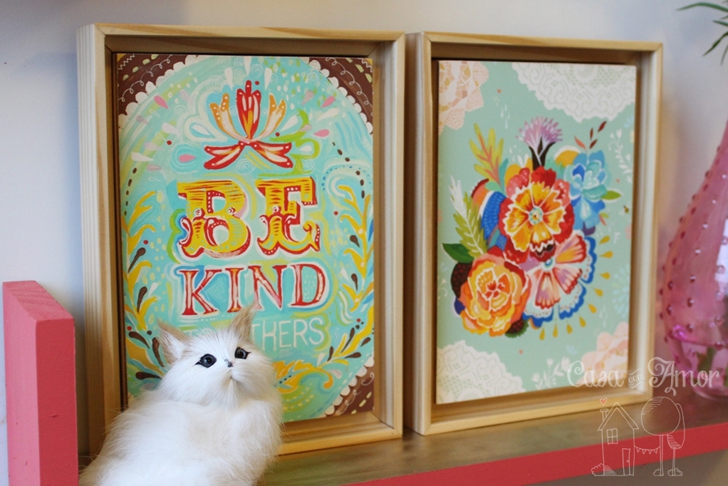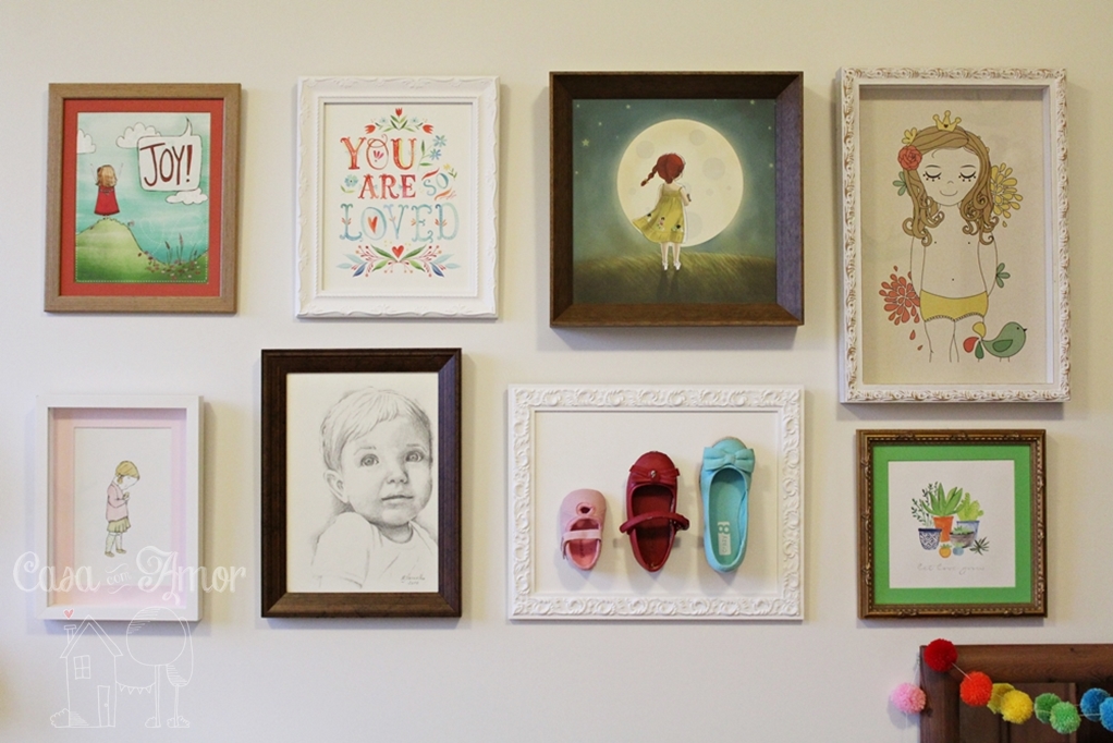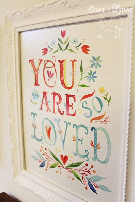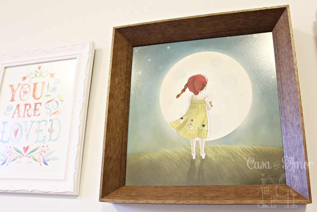 Como essa garotinha tem uma fascinação pelo céu, pelo espaço e pelos planetas, achei que essa ilustração seria perfeita para o quarto, e escolhi uma moldura de madeira chanfrada pra ela.quarto feliz 1081 quarto feliz 1131 O desenho feito pela avó, quando a pequena tinha um aninho, já estava no Quarto Lindo-Lindo e ganhou seu lugarzinho especial nesta composição também. :)quarto feliz 1091Acima dele, essa print linda e cheia de cores e flores também é da Katie Daisy. Ela diz “você é tão amada”, e pra mim transmite muito, muito amor. Tenho ela guardada há alguns anos, esperando para vir pra essa parede. :)
