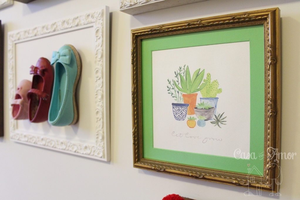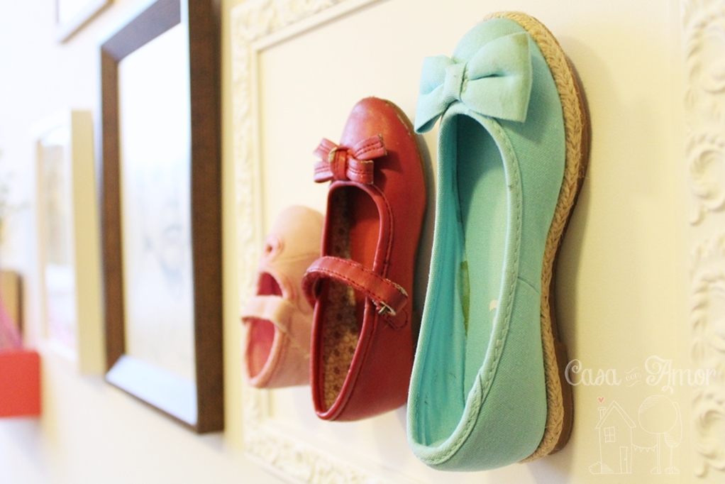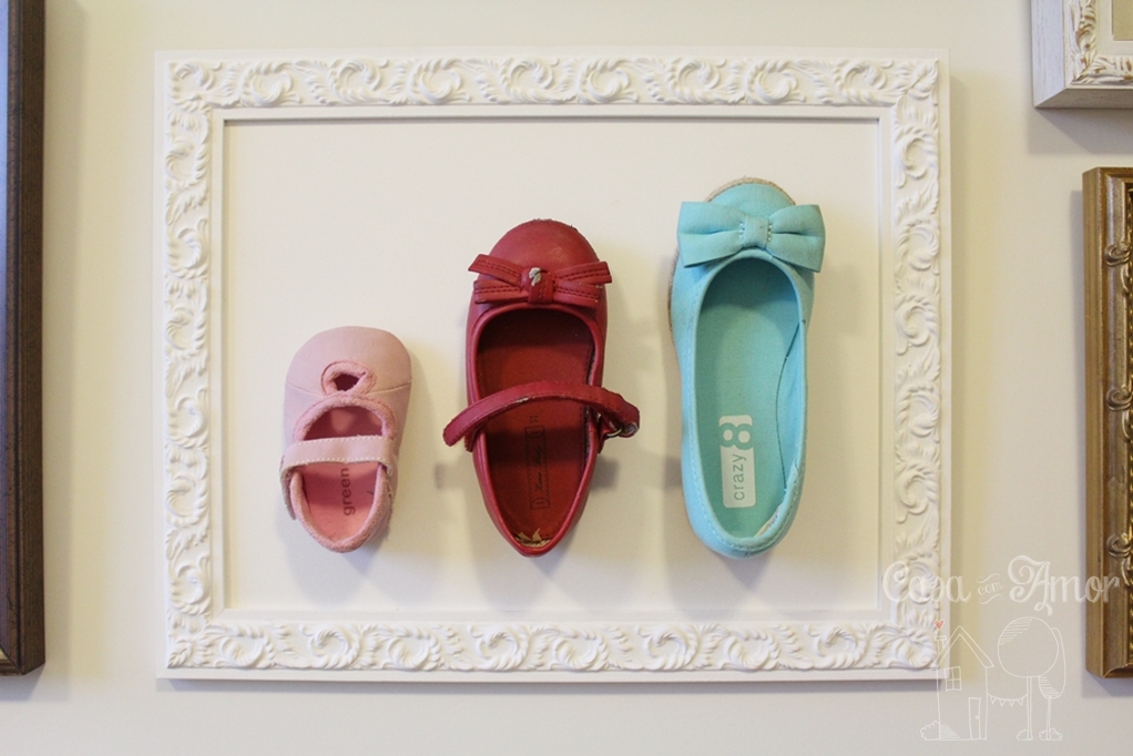 Eu guardei o primeiro sapatinho que comprei pra ela, e outros dois lindinhos que ela usou ao longo dos seus primeiros anos de vida, e colei em uma moldurinha branca.