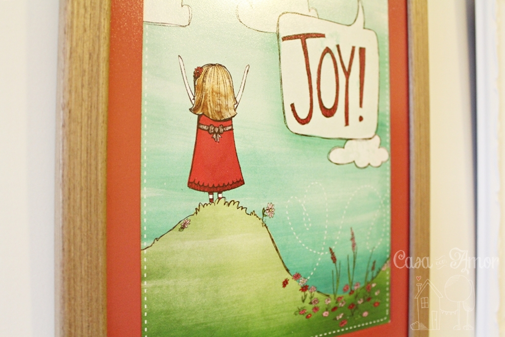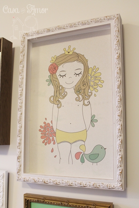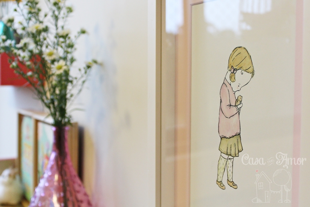 Escolhi pra ela também uma moldurinha branca com detalhes delicados.quarto feliz 1121 Essa linda print, com a palavra “alegria” vindo direto dos céus, eu comprei em 2011 da Arian Armstrong. Adoro os desenhos dela.quarto feliz 1111 E logo abaixo, a menina com o passarinho, que também já estava no quarto antigo, é da lojinha linda Trafalgar Square, e completa a composição. :)