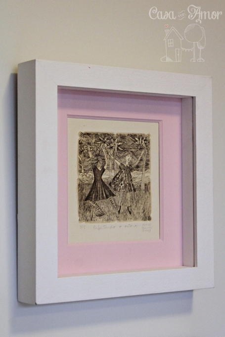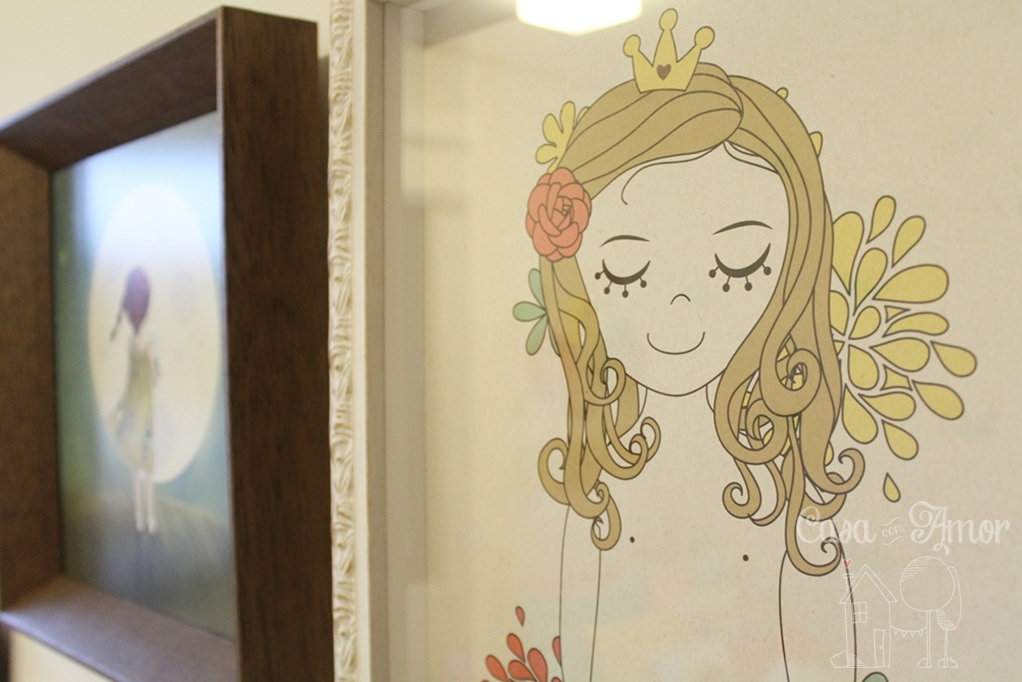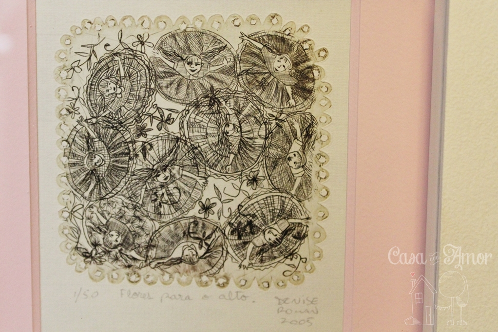 Os dois quadrinhos com litogravuras da Denise Roman, no outro quarto ficavam acima da cômoda, e eu mantive as mesmas molduras. Eu adoro a arte da Denise. Vejo muita delicadeza e romantismo, em imagens lúdicas e cheias de detalhes encantadores. :)