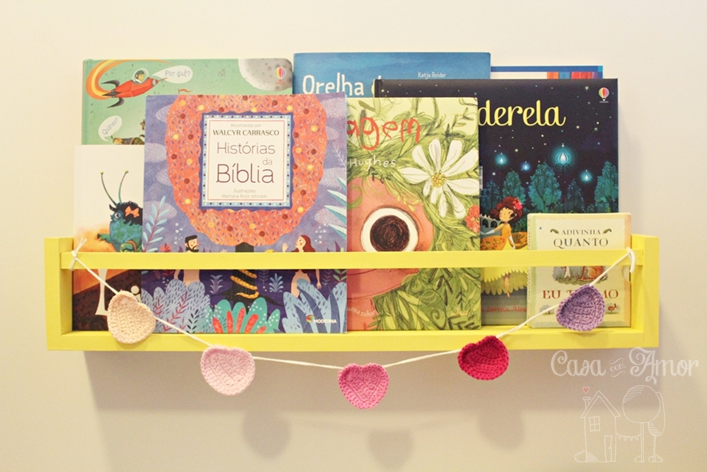 O cordão com coraçõezinhos de crochê é da Banana-Cazza e tem o tamanho certinho para a prateleira. Fofinho, né? :)
