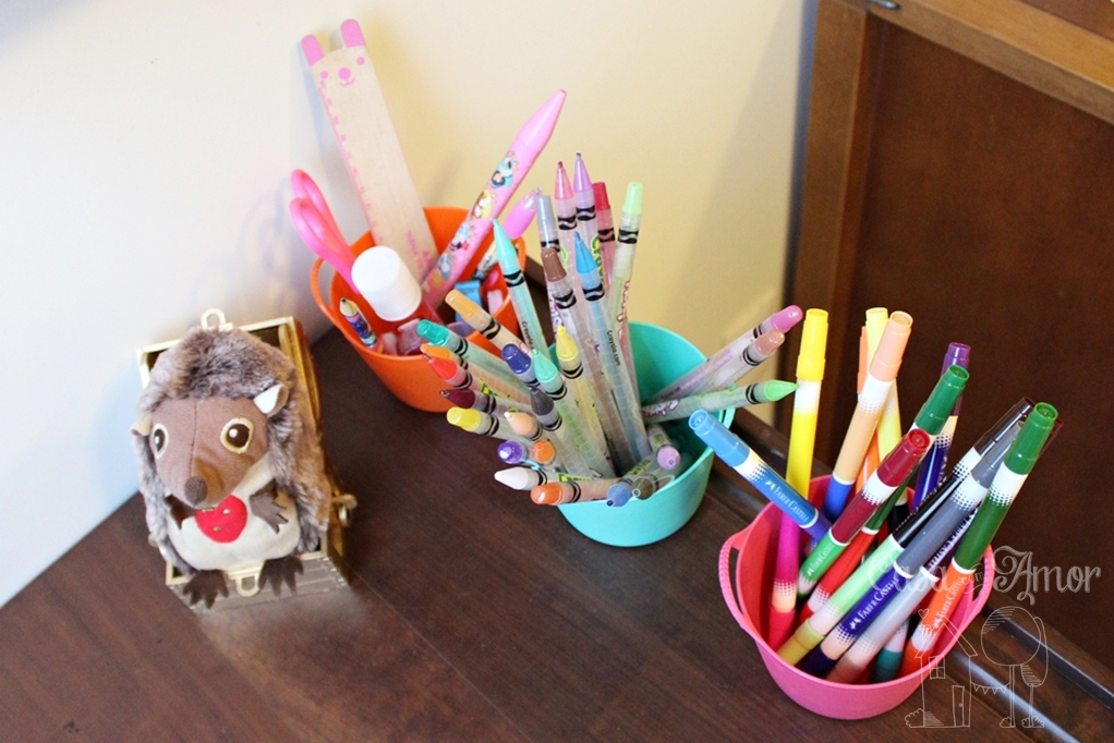 E ela fica aberta, porque pássaros devem ser livres pra voar. :)quarto feliz 791 Em cima da carteira, mini tub rugs da Casa que Tem com os materiais artísticos, e um porco espinho de pelúcia fofinho da Ikeaquarto feliz 801 quarto feliz 811