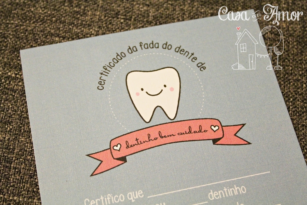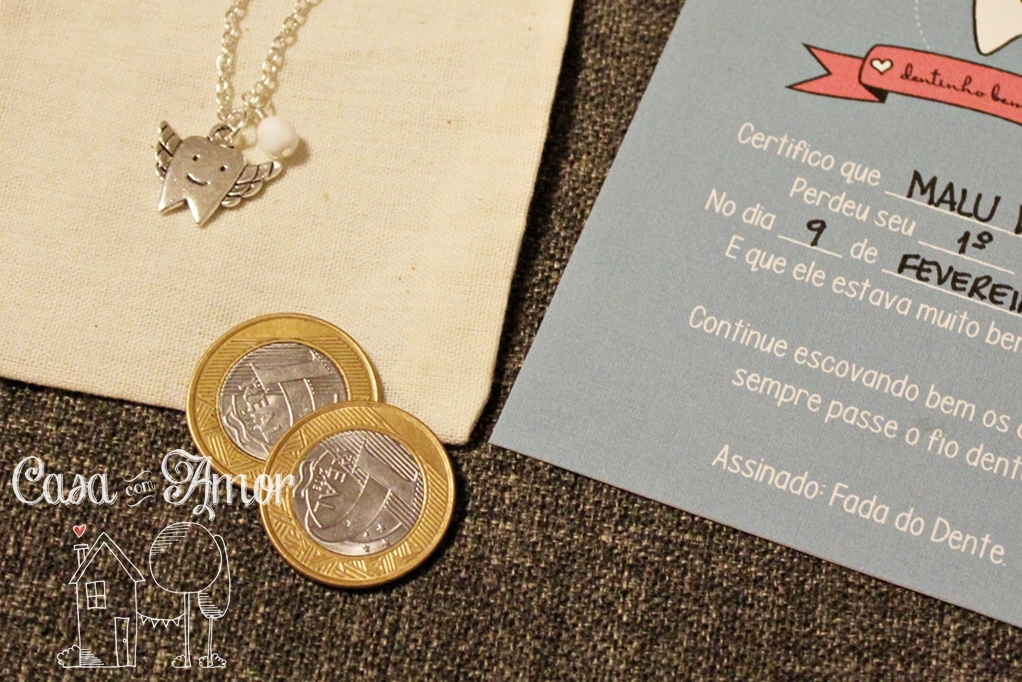 Então amanhã, quando ela acordar, vai encontrar duas moedinhas de um real e o colarzinho. E um pequeno certificado da Fada do Dente, parabenizando pelo dentinho bem cuidado e incentivando a higiene dos dentes.