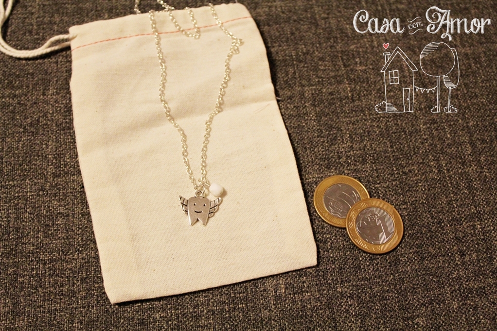 Eu já tinha comprado, há quase um ano atrás, na Etsy, um colarzinho com pingente de dentinho pra quando esse dia chegasse. Não pensava na fada, mas em um presente que eu daria a ela, pra lembrar desse dia.