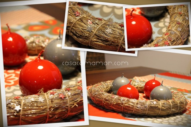 Nossa coroa de advento, que é só uma guirlanda de palha, amarrada com fio encerado, e coberta por estrelinhas de papel e mucha purpurina, e as velas dentro.