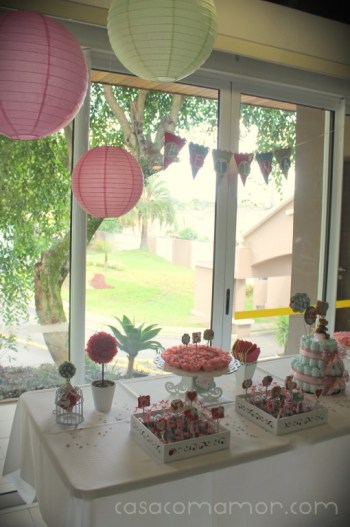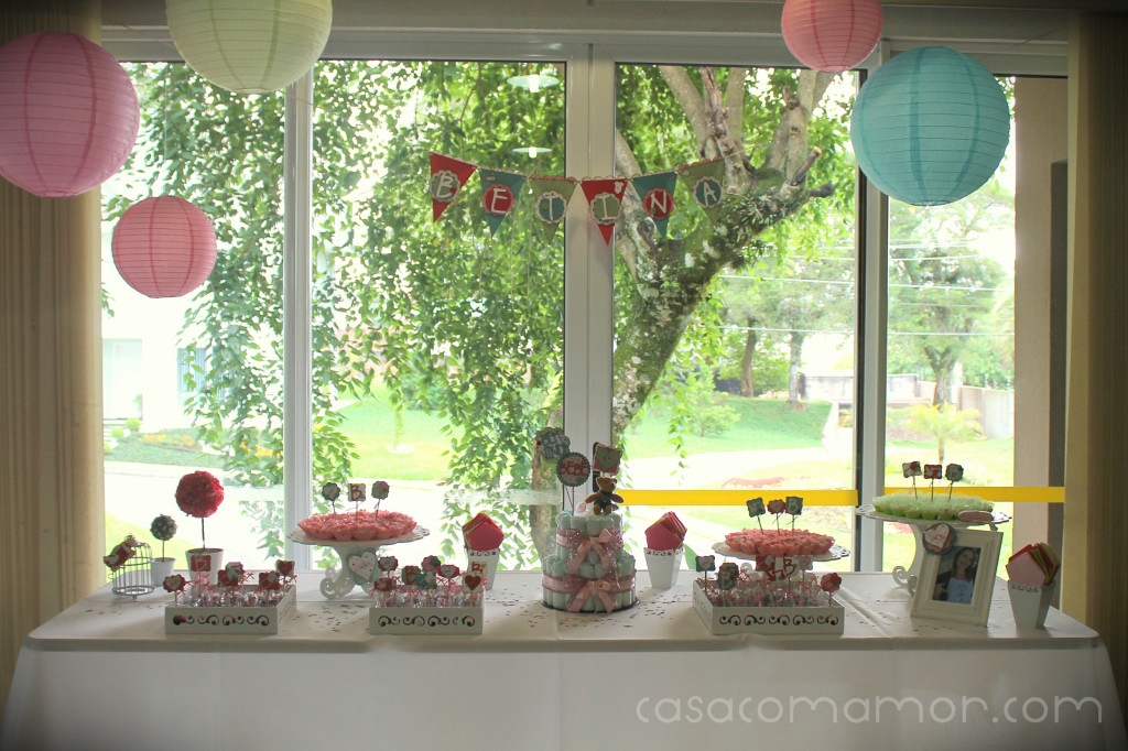E a mesa de doces, que também tinha um belo vaso de astromélias brancas, pratarias antigas, roupinhas lindas, o banner e mais pompons.