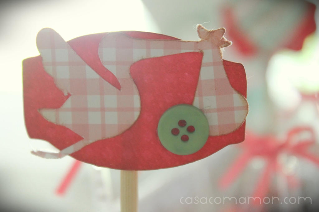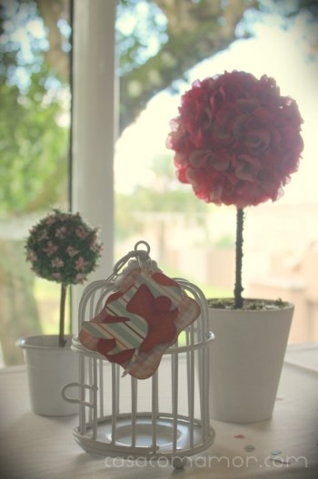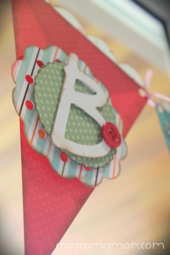 Os pompons, dessa vez prendi com fita de cetim, pra ficar aparente mesmo, e o banner foi feito com 10 bandeirolas de 3 camadas.