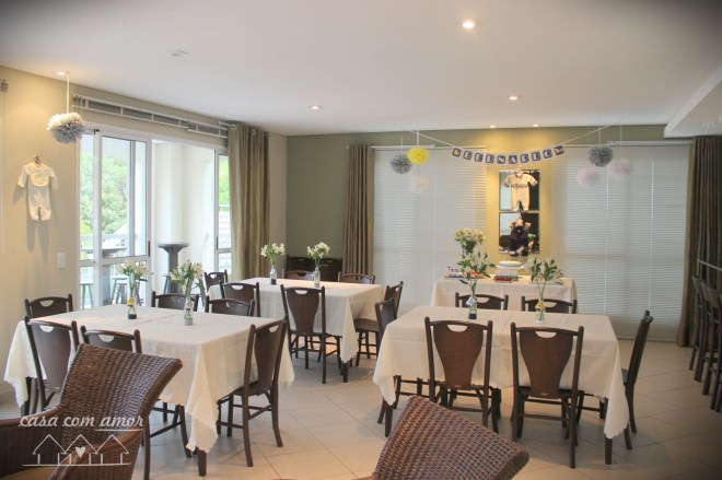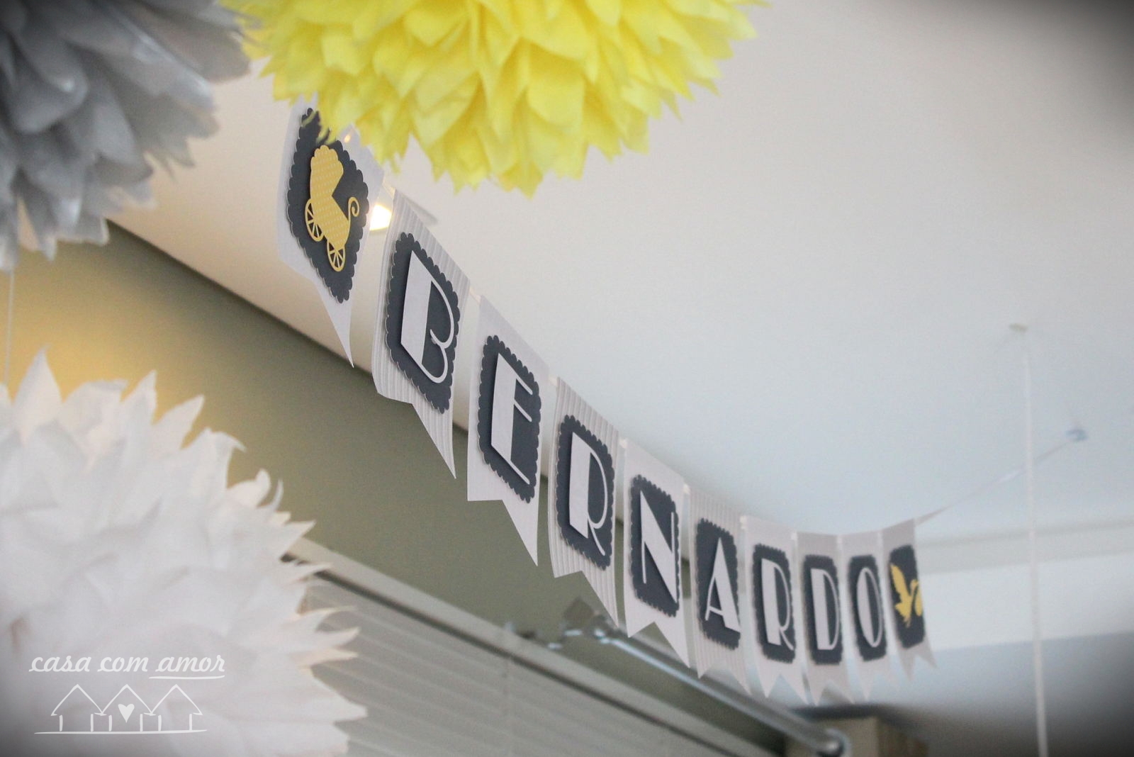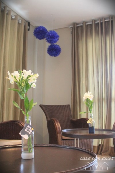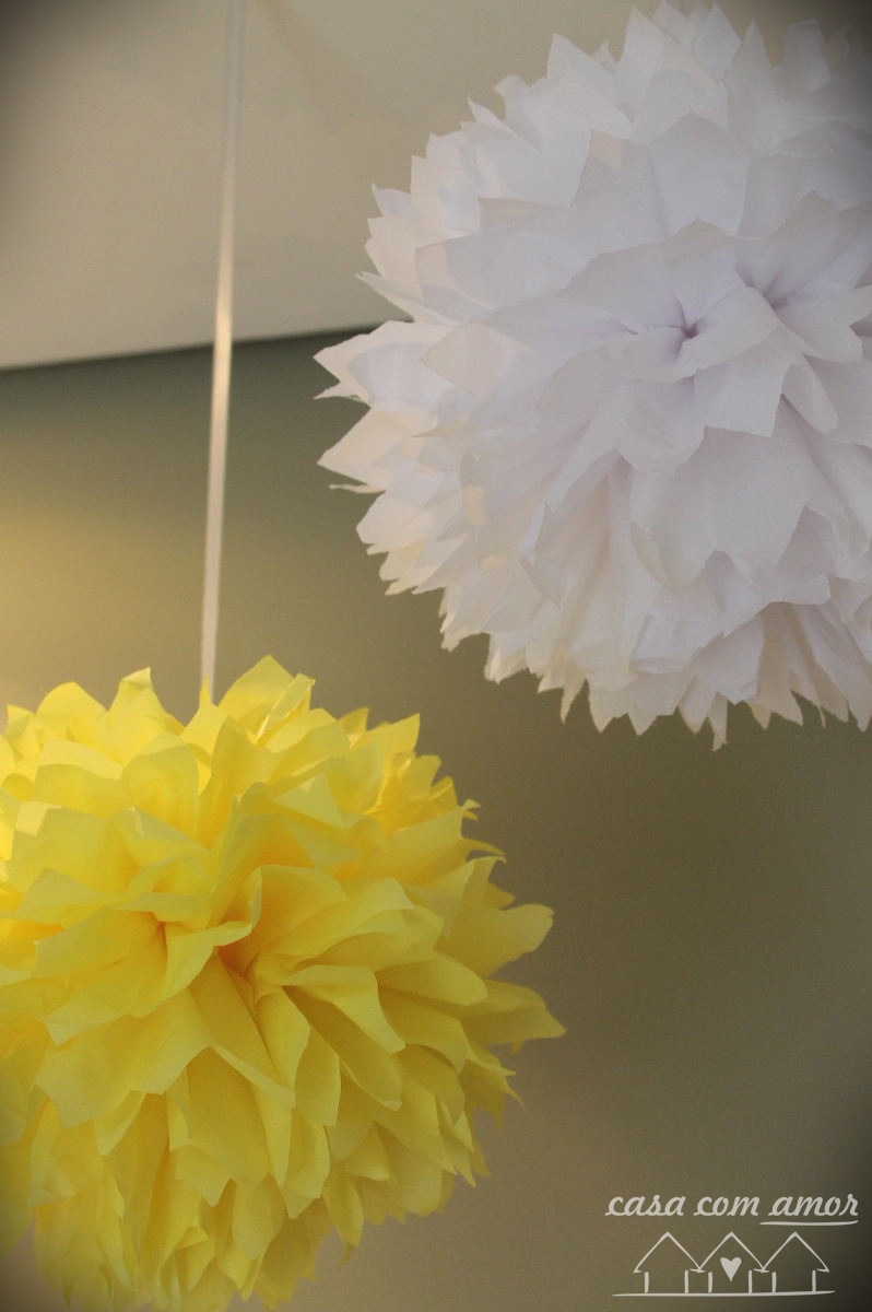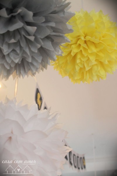 E pendurei os pomponzinhos da festa arco íris, que ficaram lindinhos ali.