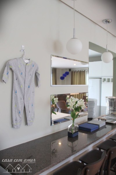 Ao lado do espelho, pendurei dois puxadores, que fazem o trabalho de ganchos, onde a moradora pendura seu pijaminha pela manhã e as roupas que estão em uso. Os dois são da Zara Home também.