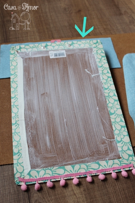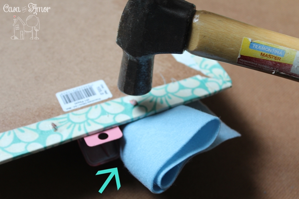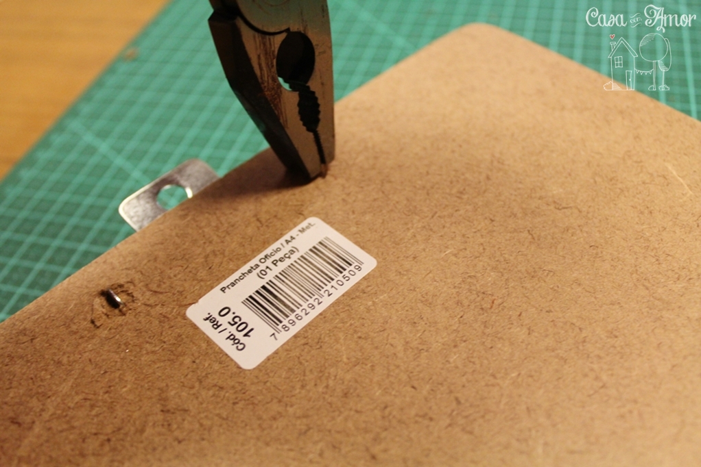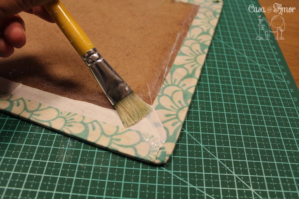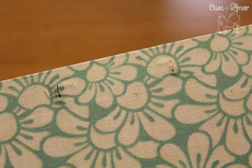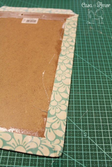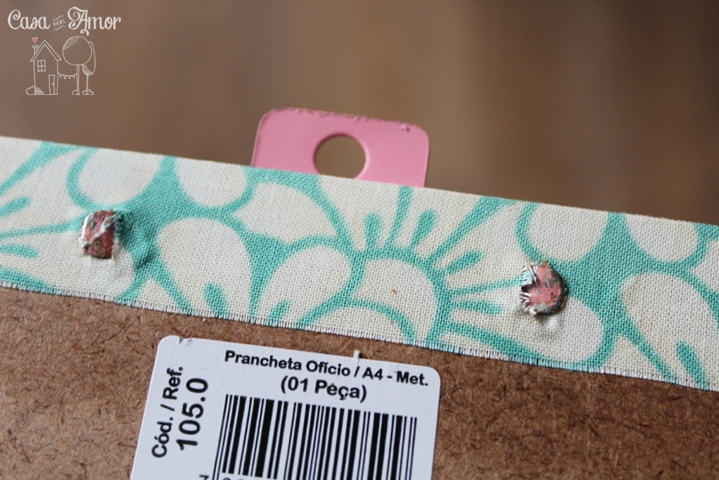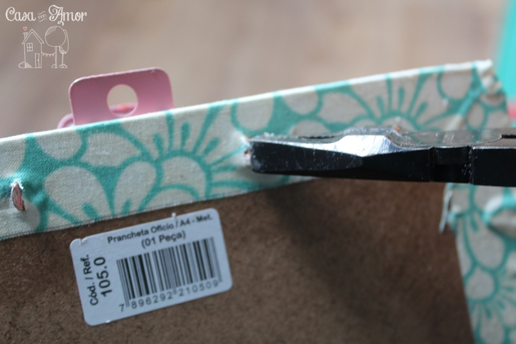 Aí dobro as bordas pra dentro, sempre começando pelo centro e depois indo para os cantos, e sempre puxando bem pro plástico ficar bem rente à capa.