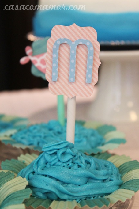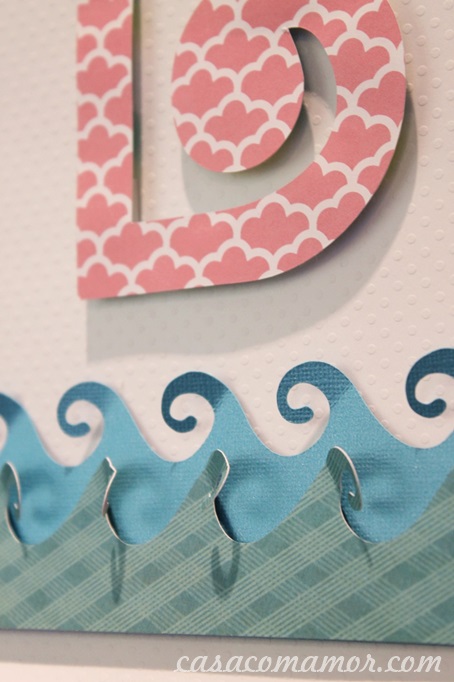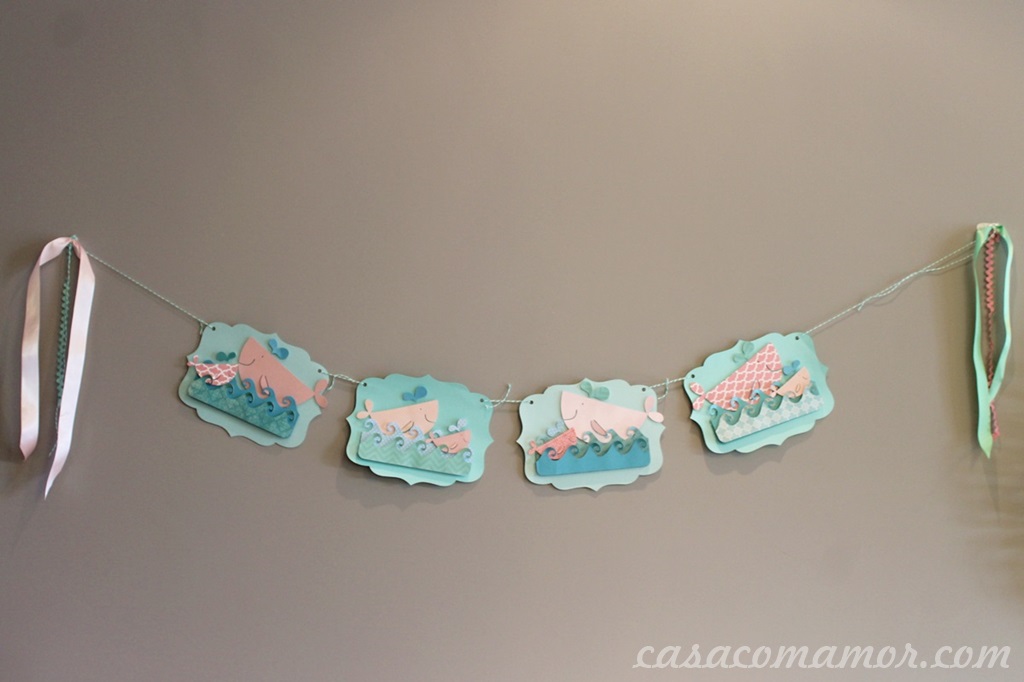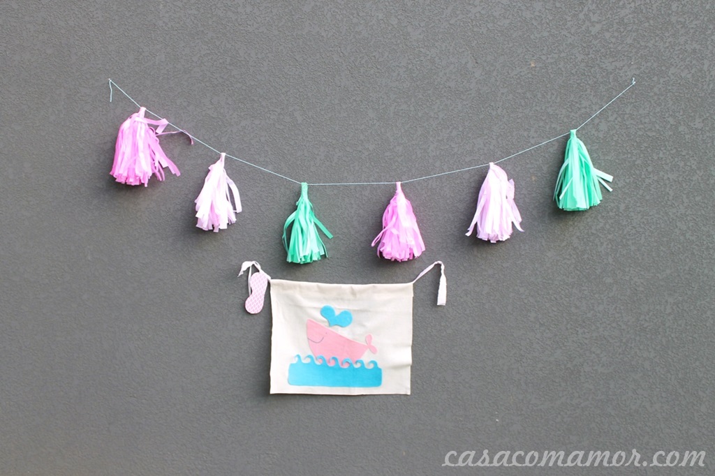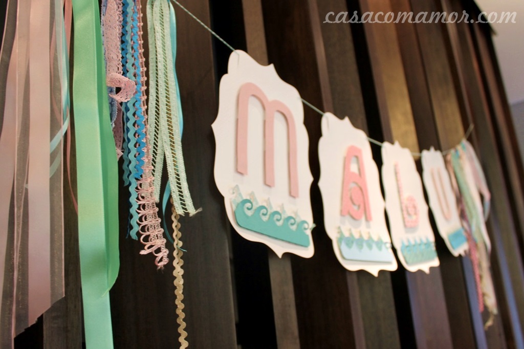 Fiz bandeirinhas de papel de scrapbook pra colocar no pé da cama.